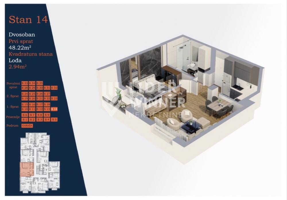 Strukturu stana čine dnevni boravak sa trpezarijom i kuhinjom, spavaća soba, kupatilo i lođa.