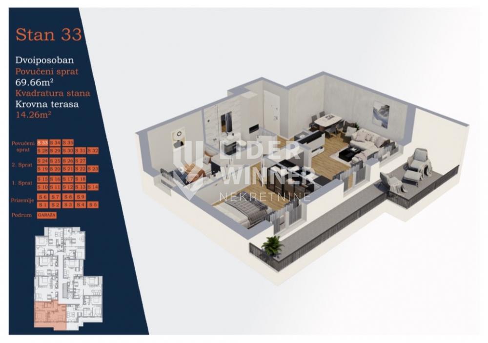 Strukturu stana čine dnevni boravak sa trpezarijom i kuhinjom, 2 spavaće sobe, kupatilo i terasa.