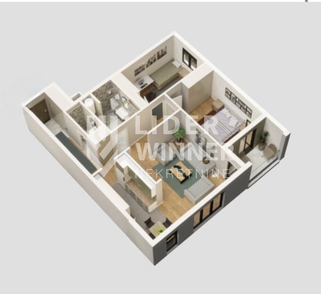 Strukturu stana čine dnevni boravak sa trpezarijom i kuhinjom, 2 spavaće sobe, kupatilo, toalet i terasa.