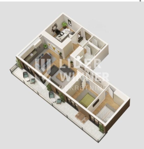 Strukturu stana čine dnevni boravak sa trpezarijom i kuhinjom, 3 spavaće sobe, kupatilo, toalet i terasa.