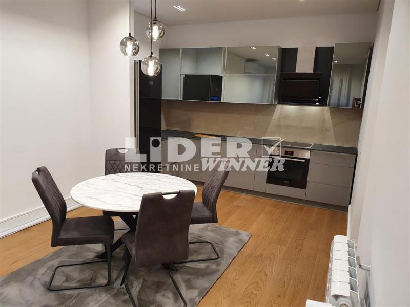 Stan se sastoji iz dve spavaće sobe od kojih je jedna ,,master bedroom“sa sopstvenim kupatilom,kuhinje,trpezarije ,dnevnog boravka koji izlazi na lepu terasu ,dva kupatila.Visina plafona3m.Potpuno nov nikad useljivan.