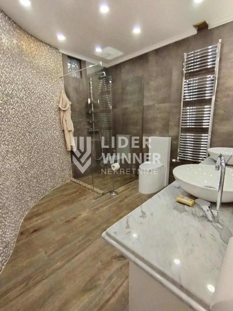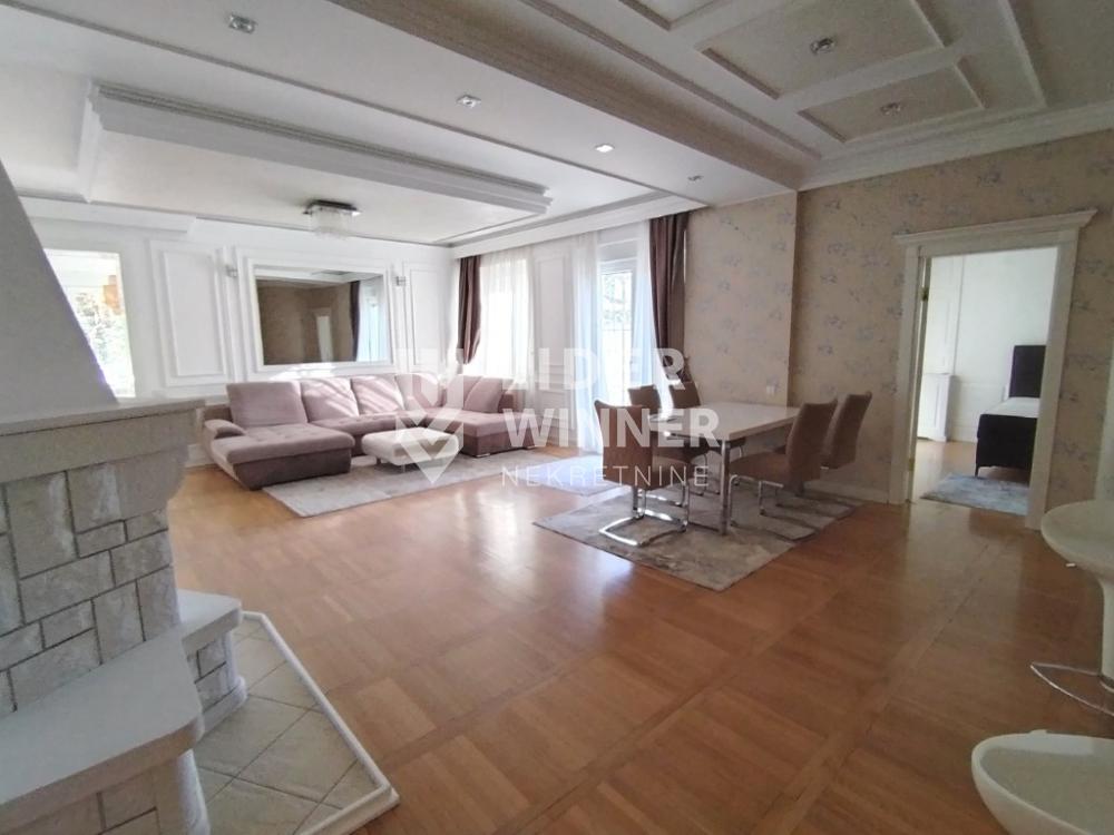 Prostorije: hodnik, prostrana dnevna soba sa prirodnim kaminom, antre, 3 spavace sobe, mala radna soba, 2 kupatila, 2 pomocne prostorije, kuhinja sa sankom, prostrana terasa (100m2) sa fontanom.