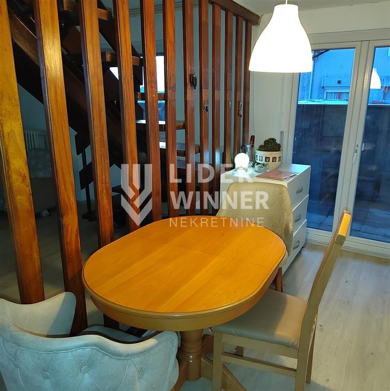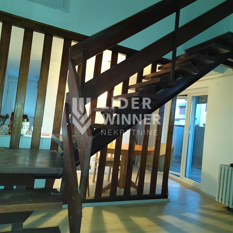 Predstavljamo vam lep, funkcionalan stan, dupleks, sa dve velike terase. Sastoji se od hodnika, kupatila, trpezarije, kuhinje, dnevnog prostora, dve terase, i na gornjem nivou dve spavaće sobe. Stan je natkriven još jednim stanom, tako da nije pod pločom. Trostrano je orjentisan i sa obe bočne strane se prostiru dve natkrivene terase od po 20m2, sa fantastičnim pogledom na grad. Ima orjentaciju istok – zapad tako da je svetao i prozračan. Stan je uknjižen i odmah useljiv. PROSTORIJE: hodnik, kupatilo, trpezarija, kuhinja, dnevni prostor, spavaća soba 1, spavaća soba 2, 2 terase. agencijska provizija 2%
